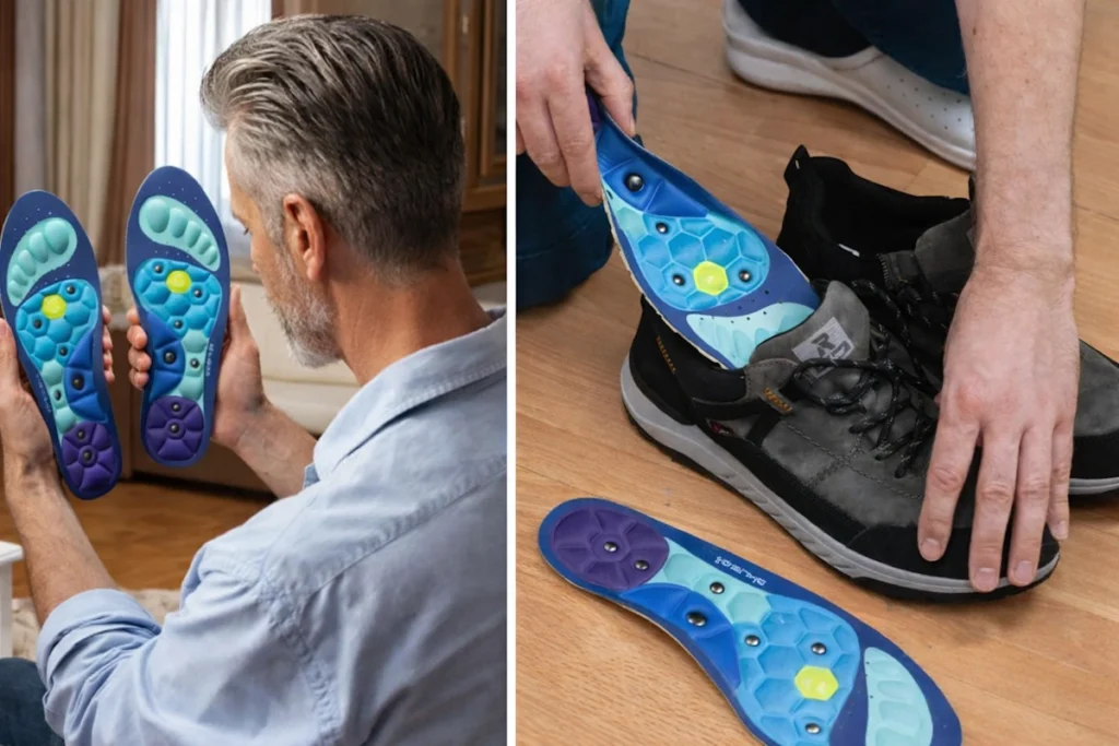 Des études suggèrent que les semelles amortissantes ou orthopédiques peuvent contribuer au confort des pieds lors des activités quotidiennes[1].